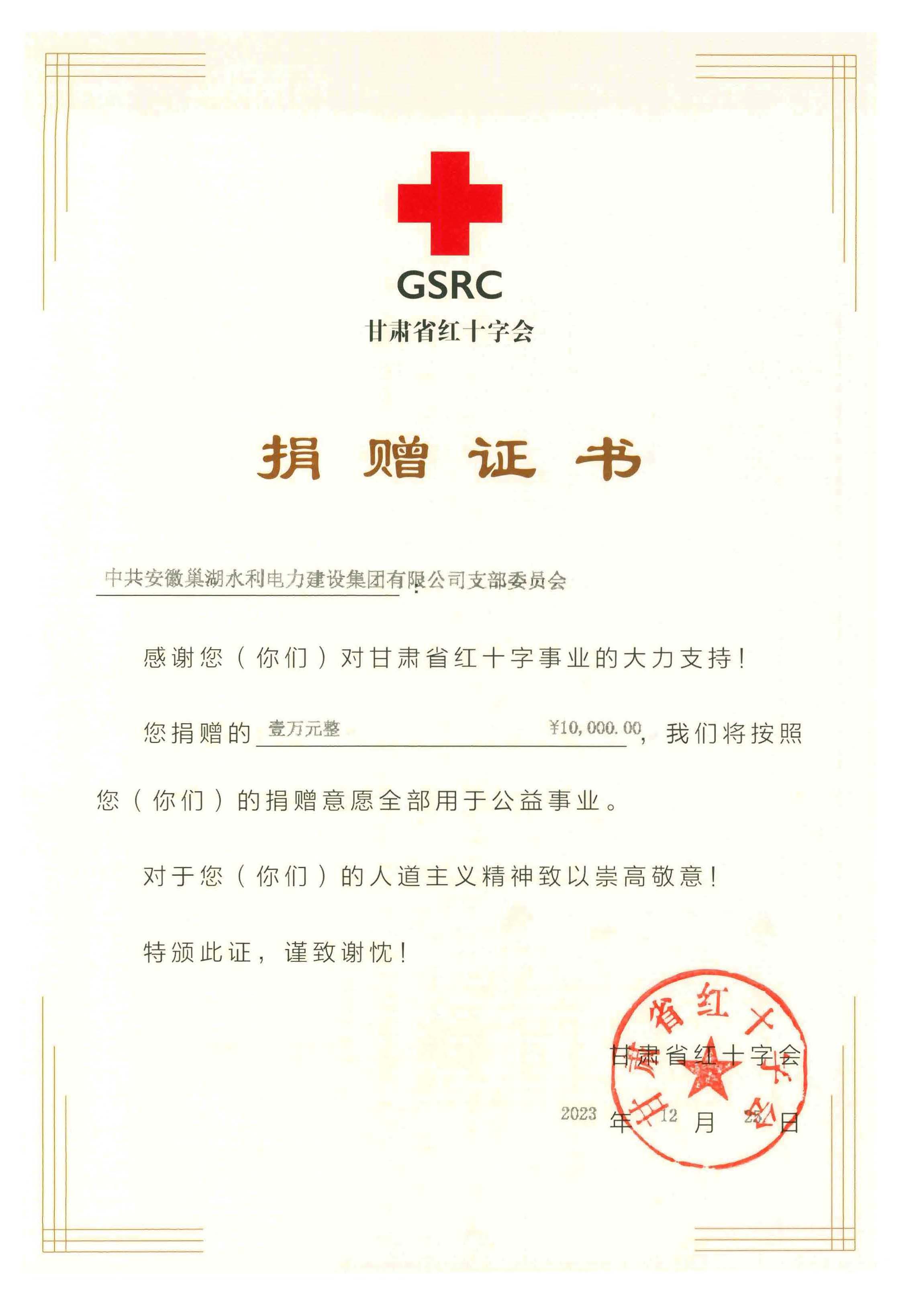 為支持災區人民抗震救災,安徽巢湖水利電力建設集團有限公司第一時間發出倡議書,號召廣大黨員干部、職工積極捐款,充分履行企業責任擔當。12月22日上午,安徽巢湖水利電力建設集團有限公司舉行向甘肅地震災區捐款活動,公司領導帶領全體員工積極參加捐款,大家同心協力、眾志成城,將愛心奉獻給災區人民。在此次活動中,公司和黨支部分別捐款5萬元和1萬元,捐款將通過甘肅省紅十字會及時送到交區人民手中,幫助災區人民共渡難關。12月25 日公司收到了來自甘肅省紅十字會分別向公司和公司黨支部發來2本捐贈證書。千言萬語繪制成一紙證書,記錄安徽巢湖水利電力建設集團有限公司全體員工與受災群眾風雨同舟、團結一心、共克災情。希望我們每個人的微小之力,積水成淵,用我們的愛心溫暖了這個冬天。