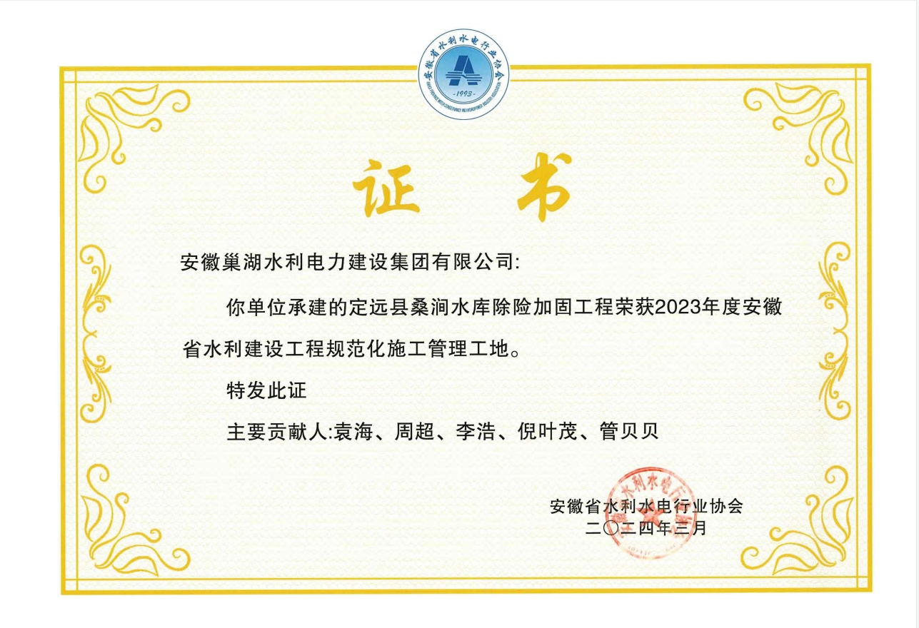 定遠縣桑澗水庫除險加固工程榮獲2023年度安徽省水利建設(shè)工程規(guī)范化施工管理工地