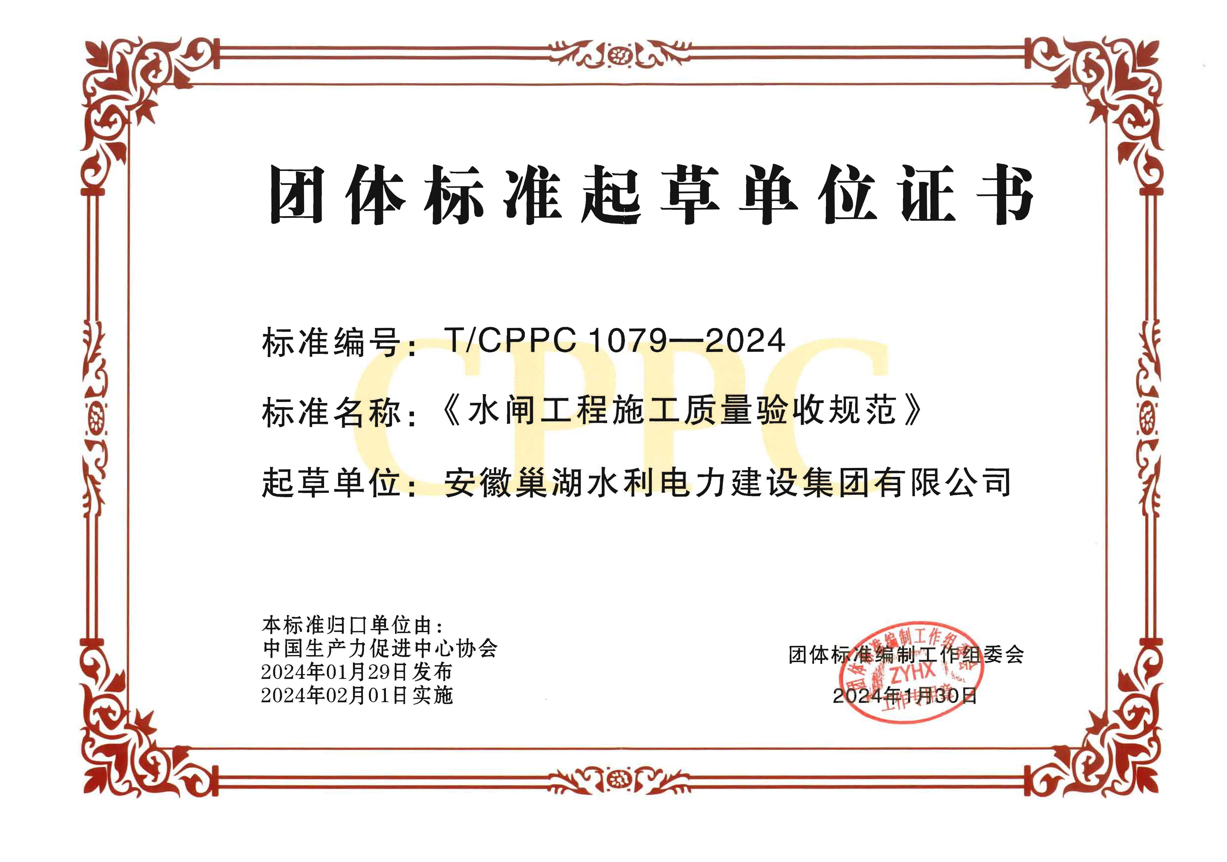 《水閘工程施工質量驗收規范》團體標準起草單位證書