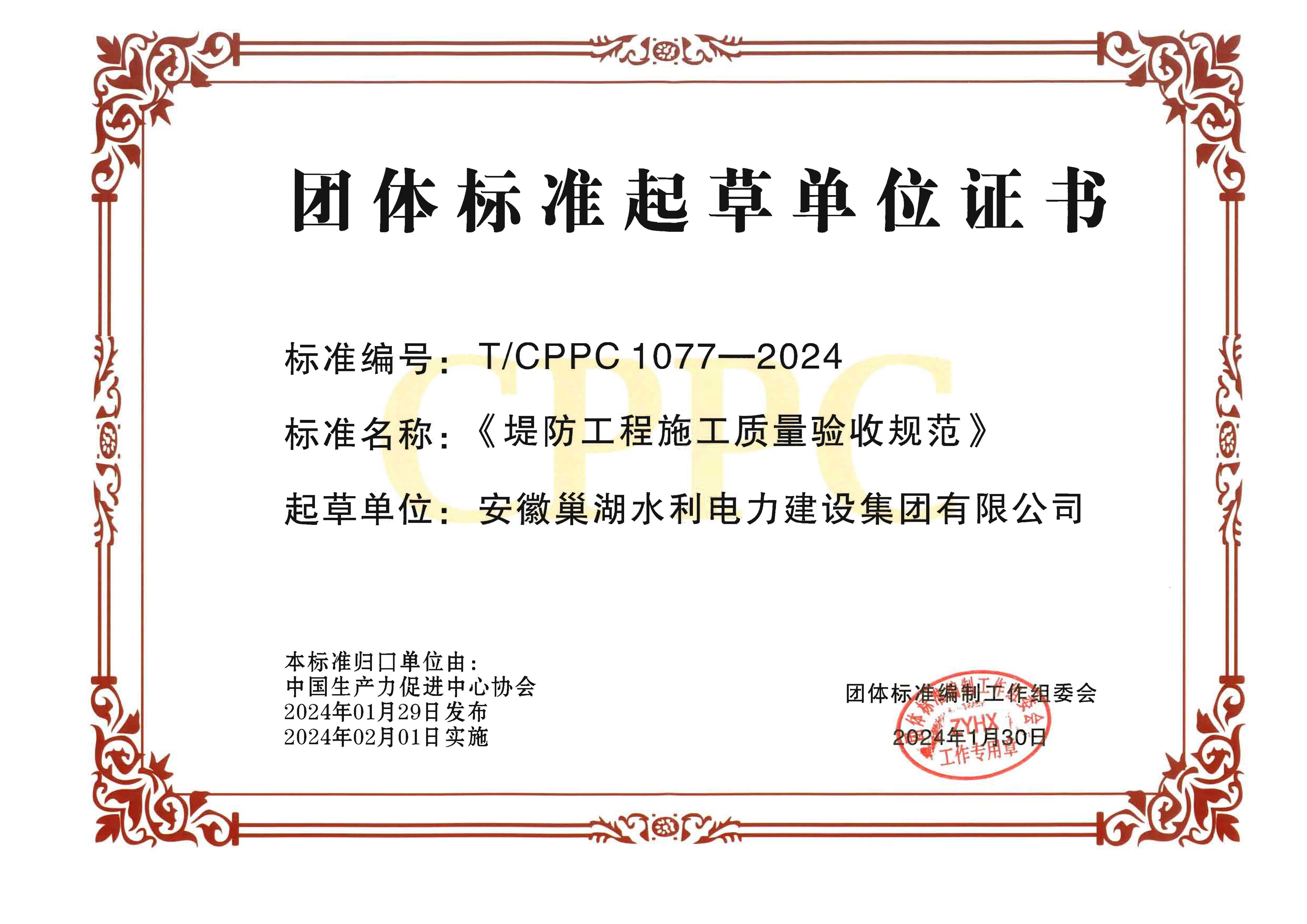 《堤防工程施工質量驗收規范》團體標準起草單位證書