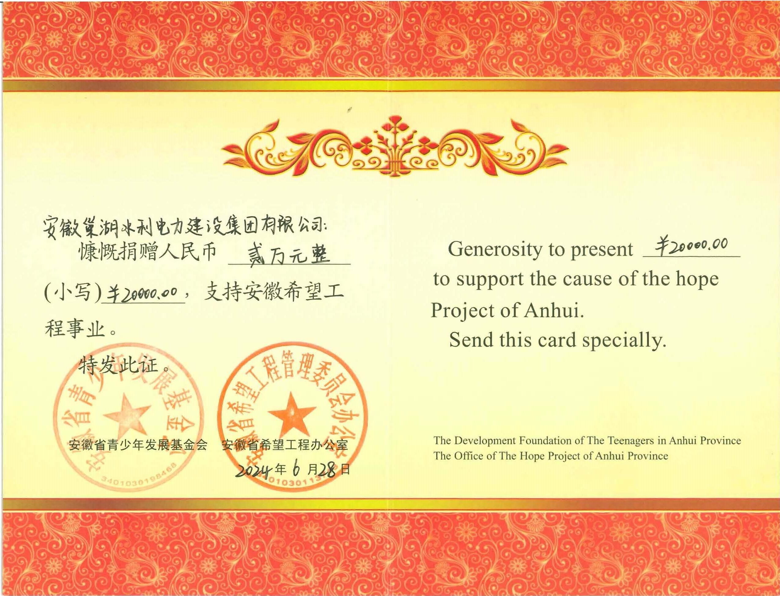 2024年6月28日安徽巢湖水利電力建設(shè)集團(tuán)有限公司捐贈(zèng)2萬元支持安徽希望工程事業(yè),以實(shí)際行動(dòng)彰顯了企業(yè)的社會(huì)責(zé)任與擔(dān)當(dāng)。我們深信在黨和政府的堅(jiān)強(qiáng)指引,社會(huì)各界的齊心協(xié)力下,災(zāi)情無情人有情,克服困難必將迎來更加美好的明天。