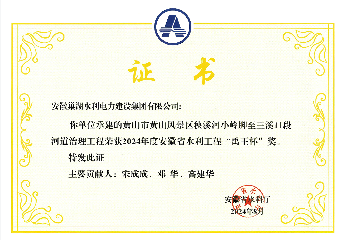 黃山市黃山風景區(qū)秧溪河小嶺腳至三溪口段河道治理工程榮獲“禹王杯”榮譽證書