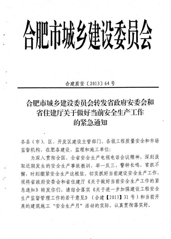 在巢各建設(shè)、施工和監(jiān)理企業(yè),局屬有關(guān)單位:?xml:namespace> 現(xiàn)將《合肥市城鄉(xiāng)建設(shè)委員會(huì)轉(zhuǎn)發(fā)省政府安委會(huì)和省住建廳關(guān)于做好當(dāng)前安全生產(chǎn)工作的緊急通知》(合建質(zhì)安[2013]64號(hào))轉(zhuǎn)發(fā)給你們,請結(jié)合合肥市城鄉(xiāng)建委《關(guān)于進(jìn)步加強(qiáng)建設(shè)工程安全生產(chǎn)監(jiān)督管理工作的若干意見》(合建[2013]31號(hào))文要求和當(dāng)前開展的安全生產(chǎn)“百日整治”行動(dòng),進(jìn)步提高認(rèn)識(shí),認(rèn)真抓好落實(shí)。 附: 附件:1.合肥市城鄉(xiāng)建設(shè)委員會(huì)轉(zhuǎn)發(fā)省政府安委會(huì)和省住建廳關(guān)于做好當(dāng)前安全生產(chǎn)工作的緊急通知 2.安徽省住房城鄉(xiāng)建設(shè)廳轉(zhuǎn)發(fā)省政府安全生產(chǎn)委員會(huì)關(guān)于做好當(dāng)前安全生產(chǎn)工作的緊急通知 3.安徽省政府安全生產(chǎn)委員會(huì)關(guān)于做好當(dāng)前安全生產(chǎn)工作的緊急通知 巢湖市住房和城鄉(xiāng)建設(shè)局 2013年7月8日 安徽省住房城鄉(xiāng)建設(shè)廳轉(zhuǎn)發(fā)省政府安全生產(chǎn)委員會(huì)關(guān)于做好當(dāng)前安全生產(chǎn)工作的緊急通知 皖建質(zhì)明電〔2013〕17號(hào) 為深入貫徹全國、全省安全生產(chǎn)電視電話會(huì)議精神,深刻汲取近期發(fā)生的安全生產(chǎn)事故教訓(xùn),舉反三,警鐘長鳴,常抓不懈,時(shí)刻繃緊安全生產(chǎn)這根弦,切實(shí)抓好當(dāng)前建設(shè)安全生產(chǎn)工作,現(xiàn)將省政府安全生產(chǎn)委員會(huì)《關(guān)于做好當(dāng)前安全生產(chǎn)工作的緊急通知》(皖安明電〔2013〕2號(hào))轉(zhuǎn)發(fā)給你們,并提出如下要求,請并貫徹執(zhí)行。 、進(jìn)步提高做好當(dāng)前住房城鄉(xiāng)建設(shè)系統(tǒng)安全生產(chǎn)工作端重要性的認(rèn)識(shí),全面落實(shí)安全生產(chǎn)責(zé)任 各級住房城鄉(xiāng)建設(shè)主管部門要牢固樹立科學(xué)發(fā)展、安全發(fā)展理念,堅(jiān)持“安全第、預(yù)防為主、綜合治理”的方針,進(jìn)步加強(qiáng)組織導(dǎo),堅(jiān)決克服麻痹松懈情緒,增強(qiáng)做好安全生產(chǎn)工作的緊迫感和責(zé)任感,全面落實(shí)安全生產(chǎn)責(zé)任。 二、突出重點(diǎn),立即開展安全生產(chǎn)大檢查 各級住房城鄉(xiāng)建設(shè)主管部門要突出重點(diǎn),特別是要針對建設(shè)系統(tǒng)行業(yè)域安全生產(chǎn)工作的特點(diǎn),結(jié)合當(dāng)前“打非治違”和“安全生產(chǎn)月” 等活動(dòng),立即部署開展次安全生產(chǎn)大檢查,全面徹底排查治理事故隱患。 1、建筑施工:深入開展以高大模板、深基坑、腳手架、垂直起重機(jī)械等重大危險(xiǎn)源為重點(diǎn)的專項(xiàng)整治工作。要強(qiáng)化高大模板專家論證、過程驗(yàn)收、日常監(jiān)管等工作,切實(shí)抓好邊坡基坑支護(hù)等防坍塌措施,進(jìn)步加強(qiáng)對腳手架、塔吊基礎(chǔ)硬化、排水措施的監(jiān)督巡查,持續(xù)抓好臨邊洞口、施工用電防護(hù)等安全措施。繼續(xù)開展“打非治違”專項(xiàng)治理行動(dòng),嚴(yán)厲打擊非法違法工程。 2、城市道路、橋梁:立即開展對既有城市道路、橋梁的隱患排查,加強(qiáng)對城市橋梁的整體結(jié)構(gòu)安全性、安全護(hù)欄以及自動(dòng)扶梯等重點(diǎn)環(huán)節(jié)、部位的監(jiān)督檢查,并通過此次大檢查建立健全城市道路、橋梁日常檢測維修的長效機(jī)制。 3、燃?xì)狻⒐┧杭訌?qiáng)對燃?xì)狻⒐┧髽I(yè)的日常巡查監(jiān)督工作,確保城市生命線工程的正常運(yùn)營,督促企業(yè)完善應(yīng)急預(yù)案,定期開展應(yīng)急演練。 4、風(fēng)景名勝區(qū):各風(fēng)景名勝區(qū)管委會(huì)要做好節(jié)假日期間景區(qū)內(nèi)火災(zāi)隱患排查治理工作,加強(qiáng)對應(yīng)急疏散通道的檢查,保證游客應(yīng)急通道暢通。結(jié)合“安全生產(chǎn)月”活動(dòng),在景區(qū)內(nèi)積開展安全宣傳活動(dòng)。 5、城市軌道交通:加強(qiáng)對城市軌道交通工程防坍塌措施的檢查,以及做好對基坑支護(hù)、周邊建筑物沉降的實(shí)時(shí)監(jiān)控,并完善各項(xiàng)安全應(yīng)急措施。 三、加強(qiáng)督查和處罰力度,切實(shí)增強(qiáng)安全監(jiān)管工作實(shí)效 各級住房城鄉(xiāng)建設(shè)主管部門要加強(qiáng)監(jiān)督檢查,推進(jìn)各項(xiàng)安全工作落實(shí)到位,對排查出的安全隱患采取“零容忍”措施,該停工的律停工、該停產(chǎn)的律停產(chǎn)、該處罰的律處罰。要做到切隱患?xì)w零后,方可投入生產(chǎn)。要充分利用“安全生產(chǎn)月”活動(dòng)的有效載體,廣泛宣傳“強(qiáng)化安全基礎(chǔ),推動(dòng)安全發(fā)展”的主體,宣傳典型,加大對違法行為、典型事故案例、重大事故隱患的曝光力度,形成社會(huì)監(jiān)督的強(qiáng)大合力,促進(jìn)安全生產(chǎn)形勢持續(xù)穩(wěn)定好轉(zhuǎn)。 安徽省住房和城鄉(xiāng)建設(shè)廳 2013年6月9日 關(guān)于做好當(dāng)前安全生產(chǎn)工作的緊急通知 (皖安明電〔2013〕2號(hào)) 各市人民政府,省直有關(guān)部門: 為貫徹全國、全省安全生產(chǎn)電視電話會(huì)議精神,深刻汲取